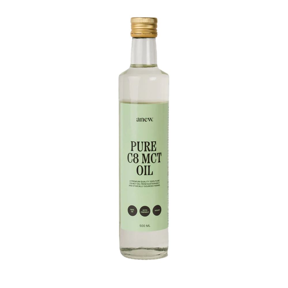 Ren C8 MCT-olja utvunnen från kokosnötter, som stödjer ketonproduktionen och energinivåerna. Din dagliga boost för förbättrad mental klarhet och ämnesomsättning. Anew MCT olja är en fettsyra som snabbt tas upp i kroppen och ökar både energinivån och fettförbränningen. Det är därför som den här typen av fettsyror är så uppskattad av idrottare och andra aktiva människor. MCT står för Medium-Chain Triglycerides och är en typ av fettsyra som är uppbyggda av medellånga molekylkedjor. Vår MCT-olja innehåller fettsyror i form av kaprylsyra, C8, som är framställd till 100% av kokosnötter. MCT tas upp i magsäcken för att sedan omvandlas till energi i levern. MCT tas upp snabbt i kroppen och bildar ketoner. ANVÄNDNING Rekommenderad daglig dos för vuxna: Börja med 5 ml första dagarna för att sedan öka till 2 matskedar (30ml) per dag eller enligt rekommendation. Rekommenderat dagligt intag bör ej överskridas. Kosttillskott bör ej användas som alternativ till varierad kost. Förvaras mörkt och svalt utan direkt solljus. Denna produkt bör placeras utom räckhåll för barn. INGREDIENSER Caprylic Acid Triglycerides (Palmfri MCT olja C8) gjord av kokosfettsyror. Näringsvärde per 100g per serv. (15ml) Energi (kcal) 900 128 Energi (kJ) 3766 536 Fett (g) 100,0 14,3 Mättat (g) 100,0 14,3 Varav C8 (Uttryckt som TG) (g) 99,0 14,1 Varav C8 (uttryckt som FFA) (g) 94,1 13,4 Kolhydrater (g) 0,0 0,0 Fibrer (g) 0,0 0,0 Protein (g) 0,0 0,0 Salt (g) 0,0 0,0