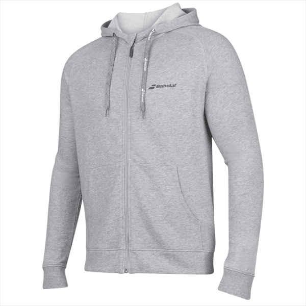 Köp en grå snygg hoodtröja med luva och dragkedja från hals till midja. Fickor på vardera sida. Muddar finns vid ärmslut samt i midja. Snygg passform. Kan bäras både på tennisbanan och padelbanan som uppvärmningsplagg eller varför inte bära den på fritiden till vardags.
