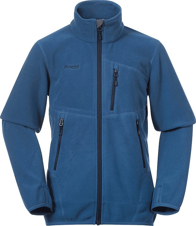 Junior Runde Jacket från Bergans är en tunn fleecejacka för barn. Fleecen har frontfickor, bröstficka och tumhål. Den har normal passform med förböjda armbågar för god rörelsefrihet, resår i ärmslut och nederkant, samt förlängt ryggparti. Material: 100 % polyester