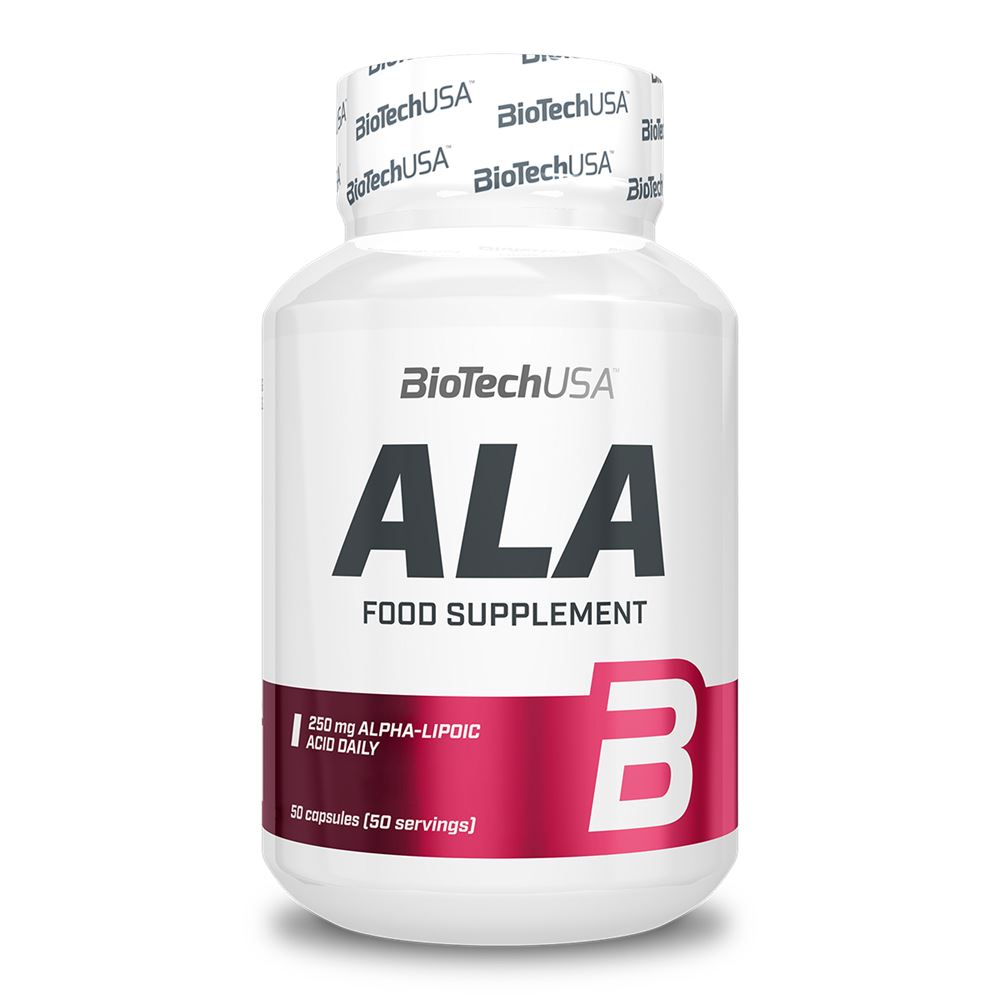 ALFA-LIPONSYRA, SOFTGELKAPSJLAR INNEHÅLLANDE 250 MG ALFA-LIPONSYRA ANTIOXIDANT. Varför rekommenderar vi ALA? 250 mg alfa-liponsyra ALA är en vitaminliknande antioxidant. Alfa-liponsyra produceras i människokroppen, men finns även i broccoli, spenat, jäst, potatis, morot, rödbeta och rött kött. Människokroppen kan även syntetisera den i små mängder; det rekommenderas dock också att ta den som tillskott. Många anser att ALA är den idealiska antioxidanten eftersom den löser sig lika bra i fett som i vatten. Den antioxidativa effekten kräver en daglig dos på 200–300 mg. Liksom alla BioTechUSA-produkter består ALA av säkra och noggrant utvalda ingredienser. Vad innehåller ALA? Dagsdos: 1 kapsel | Portioner per förpackning: 50 Näringsinnehåll 1 kapsel Alfa-liponsyra 250 mg Användning Ta 1 kapsel dagligen en halv timme före måltid! Överskrid inte rekommenderad dos! VARNINGAR: Förvaras utom räckhåll för barn! Kosttillskott ersätter inte en balanserad kost och en hälsosam livsstil. Ingredienser Alfa-liponsyra 56%, kapselskal (gelatin), maltodextrin, antiklumpningsmedel (kalciumfosfater, magnesiumsalter av fettsyror, kiseldioxid), fyllnadsmedel (cellulosagel). Tillverkad i anläggning som hanterar livsmedel innehållande mjölk, ägg, gluten, soja, jordnötter, nötter, selleri, fisk, skaldjur, blötdjur och svaveldioxid.
