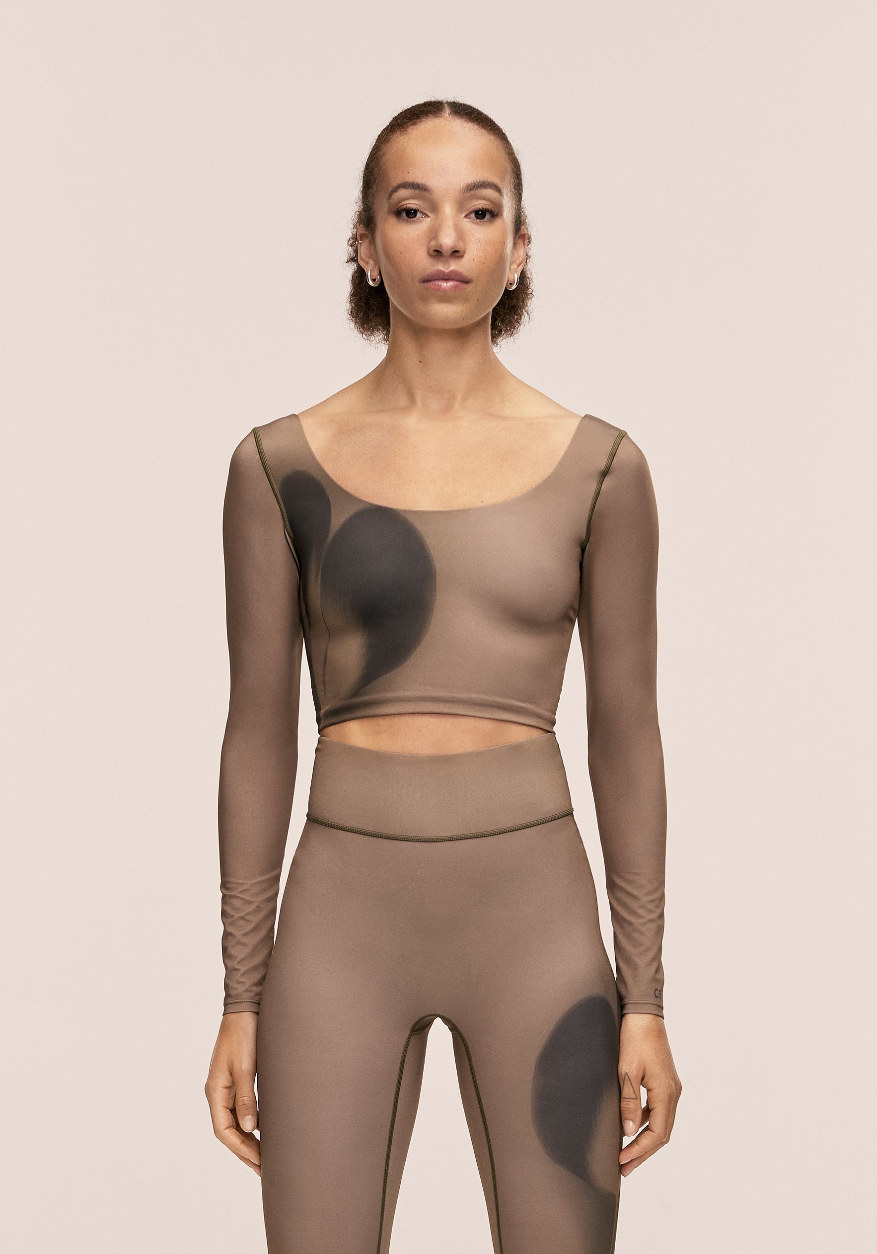 Croppad studiotopp med Aura Flower-print. Tillverkad i italienska signaturtyget Silky Support®, vårt silkiga och superstretchiga performance-tyg som känns ultralätt på benen och ger bra stöd, med en skimrande yta. Designad för yoga, Pilates och annan studioträning.