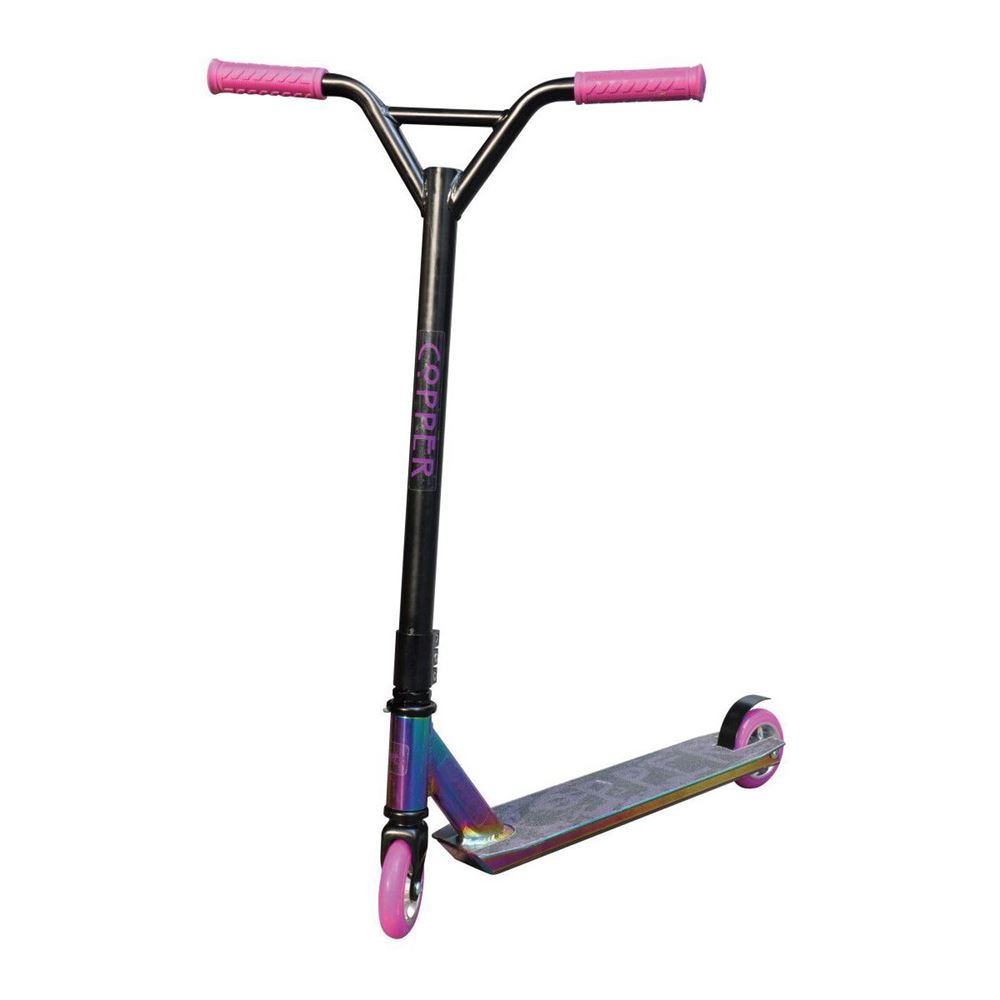 Copper Demolish Neochrome v2 är ett högkvalitativt och stilfullt sparkram med fast ram med ett neokromt däck som passar även de mest krävande skidåkare. I denna scoot hittar du 100 mm PU-däck, som är den standardstorlek som är bäst lämpad för stunt sparkar och finns i alla speider av högsta kvalitet. Slitstarka och eleganta aluminiumhjul kombinerade med högsta kvalitet ABEC-9-lager säkerställer mer friktionsfri rullning. Robust trick kick board med bra kvalitetskomponenter! Egenskaper Material: Aluminiumstållegering Hjul: aluminium Däckets mått: 50,5×11 cm Neochrome däck Handtag: PP