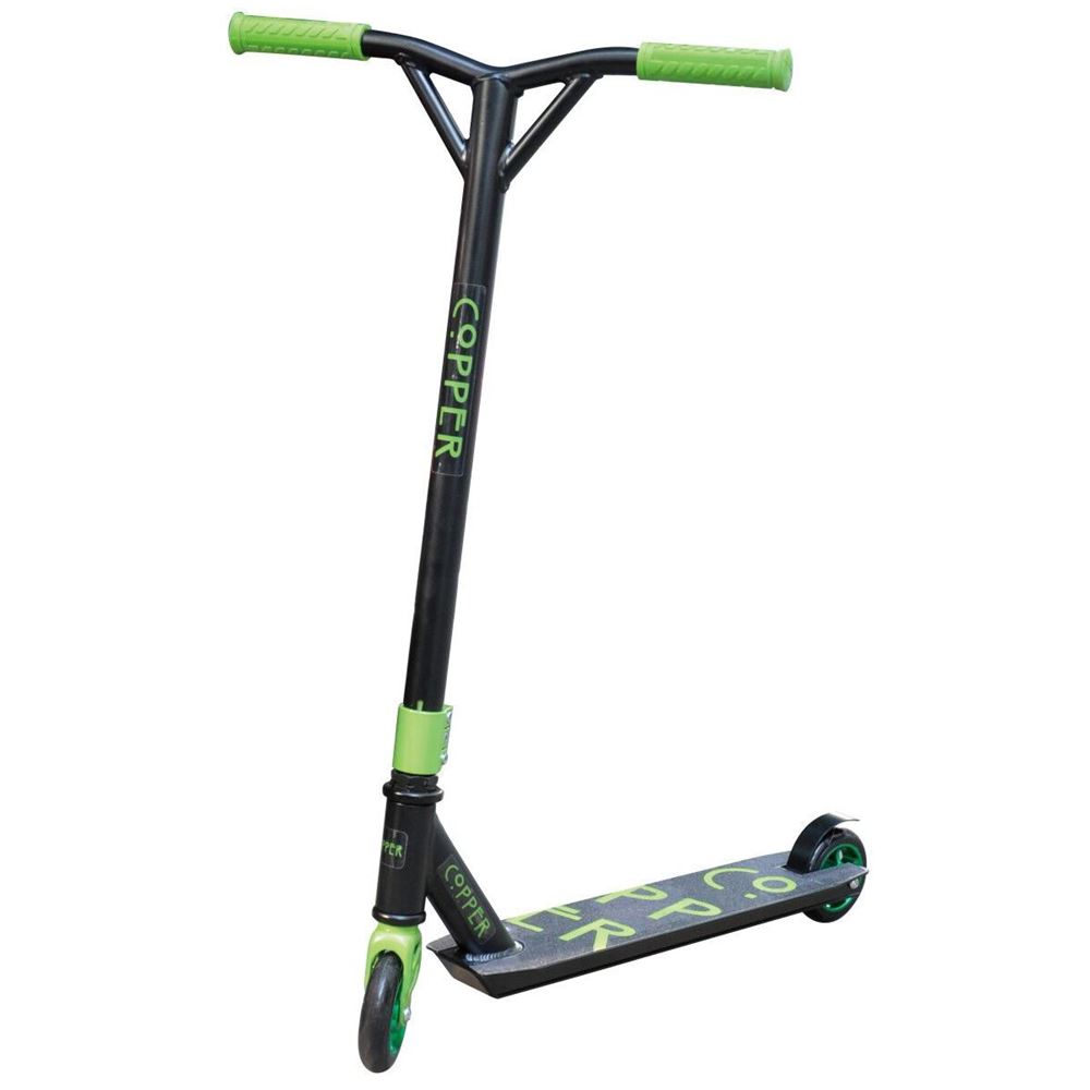 Copper Scoot Raw är ett högkvalitativt och snyggt stunt kickboard med fast ram med kalkfärgade detaljer, lämplig för både nybörjare och mer erfarna skoter. I denna scoot hittar du 100 mm PU-däck, som är den standardstorlek som är bäst lämpad för stunt sparkar och finns i alla speider av högsta kvalitet. Slitstarka och eleganta aluminiumhjul i kombination med högkvalitativa ABEC-7-lager säkerställer smidig rullning. Robust stunt kickboard med god kvalitet. Stora möjligheter att utveckla färdigheter inom parkering och gatuskoter. Egenskaper Material: Aluminiumstållegering Däckets mått: 50,5×11 cm Handtag: TPE Hjul: aluminium