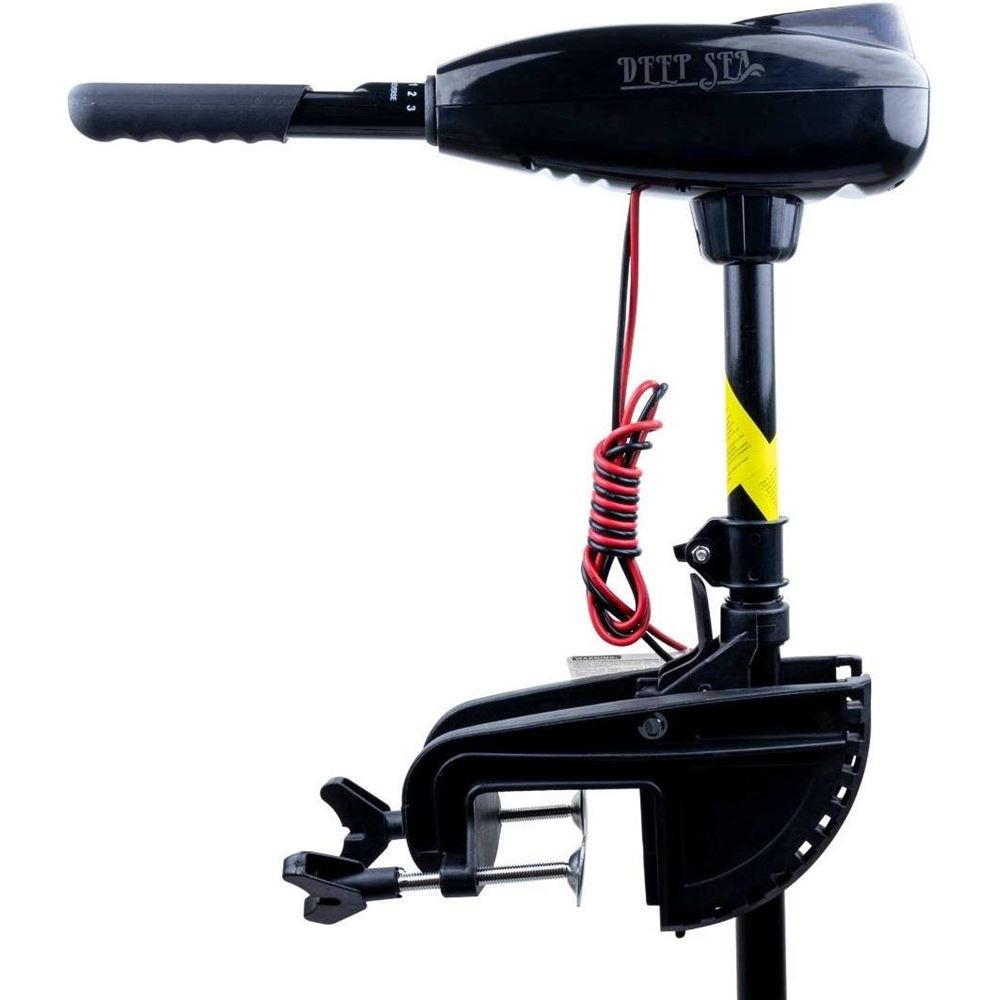 Deep Sea Elektrisk båtmotor 60LBS Högkvalitativ och tyst elektrisk båtmotor! Våra elektriska utombordsmotorer från Deep Sea är utmärkt valuta för pengarna för en ekologisk båtmotor. Den elektriska båtmotorn från Deep Sea är ett utmärkt val för ett lugnt båtliv, eftersom den är tyst och lätt, men samtidigt effektfull och lätt att hantera. Den är också ett bra val för fiske! På Deep Sea elektriska båtmotorer finns 5 växlar fram och 3 bak. 5-punkts LED-batteriindikatorn på ovansidan av båtmotorn gör det enkelt att se batteriets laddningsstatus. Tack vare den högkvalitativa propellern kan utombordaren användas i alla typer av vatten. Det 36-tums skrovet av glasfiberkomposit ger båtmotorn bra hantering och styvhet. Längden på det teleskopiska handtaget kan justeras upp till 100 mm, vilket gör det möjligt att anpassa det till olika båtmodeller. Det lutande fästet gör att motorn snabbt och enkelt kan lyftas upp ur vattnet. Båtmotorn har en steglös höj- och sänkbar stigning med vingmutterinfästning. En fena på enhetens undersida skyddar bladen. Teknisk information: Drivkraft: 60LBS/27,2 kg Ingångseffekt: 12V, 672W Stamlängd: 72 cm Handtagslängd: 100 mm (justerbar) Ström: 0,92 HK Rekommenderad batterikapacitet: 80-150Ah Propellerblad: 3 st (260 mm-9,5 mm) Vikt: 9,2 kg Mått: 130x48x17cm CE och RoHS godkända Längder på batterikablar: Pluskabel (röd): ca 140 cm Minuskabel (svart): ca 150 cm Notera. Batteri ingår inte!