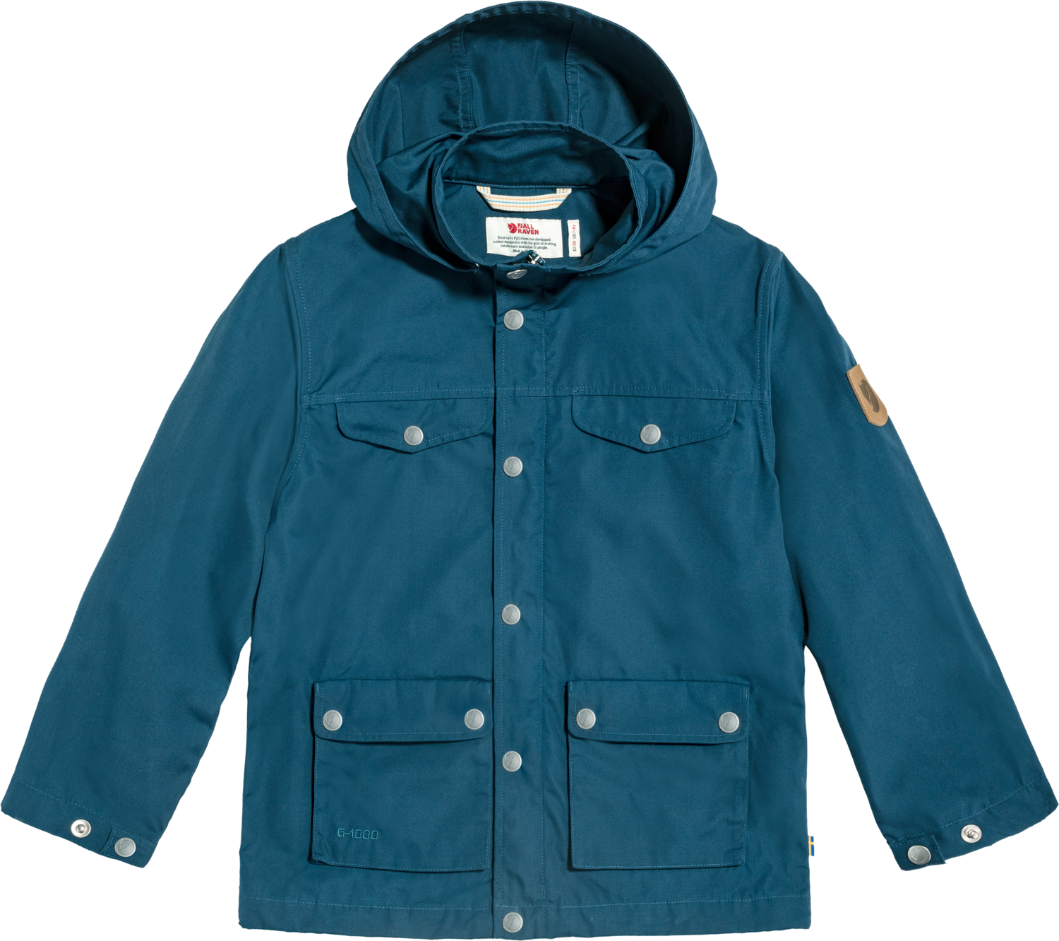 Kids Greenland Jacket är juniorversionen av Fjällrävens populära grönlandsjacka som är perfekt för vardagens lek och påhitt. Den är gjord av G-1000 Eco som står emot vind och väta, klarar närkontakt med terrängen och är så slitstark att jackan kan hålla i flera år framöver. Huvan är avtagbar och det finns gott om fickor för skogens fynd. De vattenavvisande egenskaperna kan förstärkas med Grönlandsvax som också ökar slitstyrkan hos G-1000-väven. Slitstark, vind- och vattenavvisande G-1000 Eco. 65% återvunnen polyester, 35% ekologisk bomull. Två bälgfickor med lock plus sidoöppningar med dragkedja. Två bröstfickor med lock och knäppning. Dubbelt tyg över axlar och armbågar. Rejäl tvåvägs dragkedja med knappslå. Ärmslut med tryckknappar. Dragskojustering nertill. G-1000® Eco: 65% polyester, 35% bomull