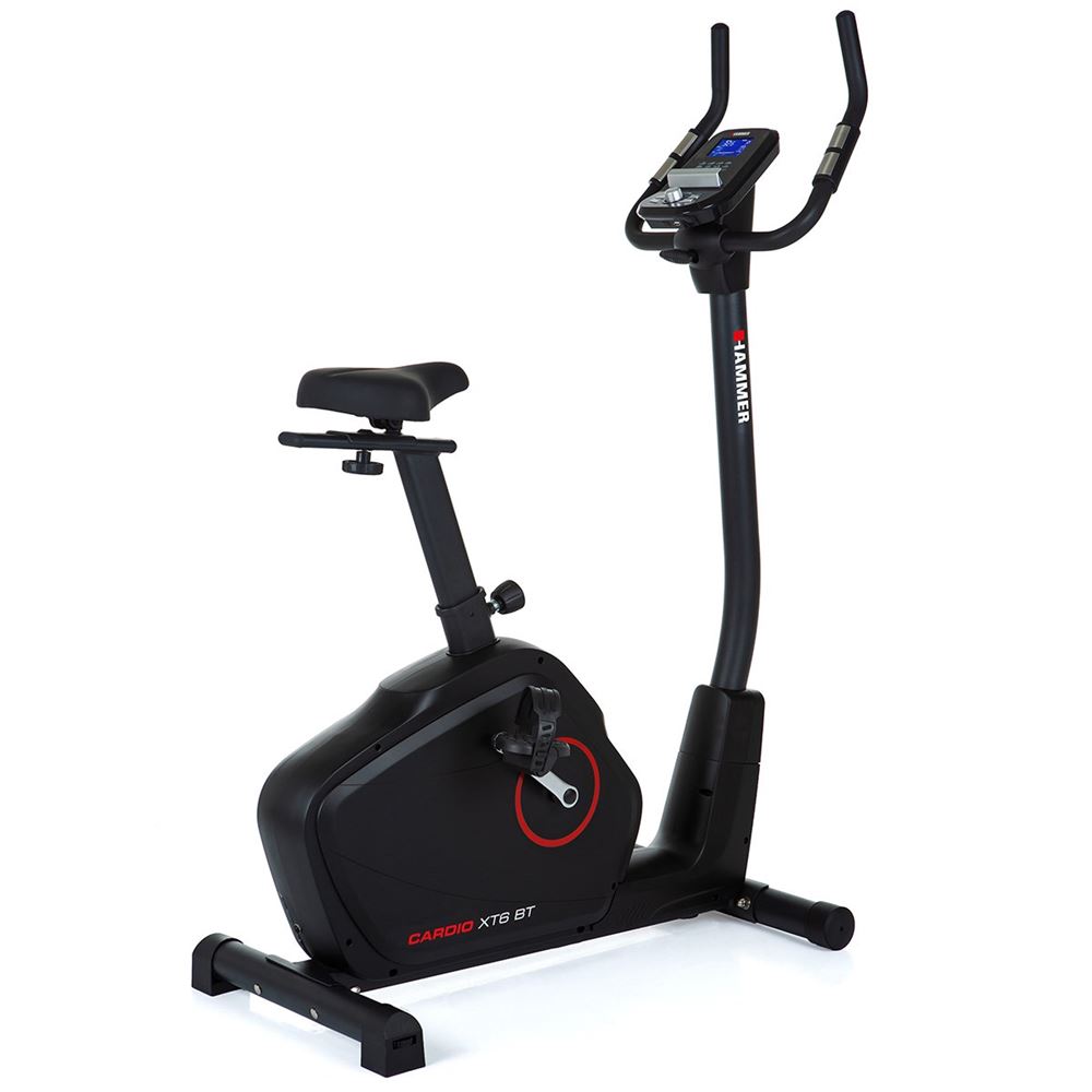 Lågt insteg för enkel påstigning Optimalt pedalavstånd – skonsamt för höfterna Träna med appar för en upplevelse med livesträckor Olika inställningar för styret för ryggvänlig träning Nu finns det inga ursäkter! Smidig och ergonomisk träning som är skonsam för ryggen Är du ute efter en stabil och bekväm ergometer med lågt insteg för enkel påstigning? Vill du ha en enkel och användarvänlig dator så att du kan komma igång direkt? Då är HAMMER Cardio XT6 den perfekta ergometern för dig. Med HAMMER Cardio XT6 kan du förbättra din kondition, gå ned i vikt och stärka ditt kardiovaskulära system. Välj mellan manuell eller automatisk inställning av motståndet samt automatiska träningsprogram. Ett 12 kg tungt svängviktssystem och ett elektroniskt magnetbromssystem ger en fantastiskt jämn och flytande gång. Motståndet är justerbart från 10 till 350 watt och justerbart i steg om 5 watt, så att även ambitiösa idrottare kan förbättra sina prestationer. Styret och sadeln kan ställas in så att alla oavsett kroppslängd kan träna på ergometern i en ställning som är skonsam för ryggen. Tack vare de integrerade premiumtransporthjulen rullar du enkelt undan din XT6 efter träningen. Kvalitetssäkring: Kvalitet x 100 000 Testad för extra lång hållbarhet Du kan vara säker på att du kan ha glädje av din Cardio XT6 under lång tid framöver, eftersom tekniken bakom ergometern har klarat ett uthållighetstest på över 100 000 varv. De tekniska komponenterna, såsom elektronik och kullager, håller hög industrikvalitet och är konstruerade för intensiv och långvarig användning. Lägsta motstånd från 10 watt! Stor bredd från 10 till 340 watt Med ergometern HAMMER Cardio XT6 kan du träna med ett lägsta motstånd på bara 10 watt. Det passar perfekt för äldre personer, för lätt rörlighetsträning efter idrottsskador eller för att påbörja träningen långsamt. Inklusive konditionstest! Perfekt för motivationen och för att öka träningen Efter träningspasset mäter du din puls. Ju snabbare din puls sjunker igen, desto mer vältränad är du. Datorn på din Cardio XT6 BT visar detta genom ett konditionsbetyg på 1 till 6. Ett bra betyg sporrar dig ännu mer och motiverar dig att prestera ännu bättre under nästa träningspass. Överskådliga indikeringar På LCD-skärmen eller din smartphone/surfplatta Med multimediekonsolen på Cardio XT6 kan du styra dina träningsdata på en överskådlig LCD-skärm (Visar: backprofiler, hastighet, tid, tillryggalagd sträcka, kaloriförbränning, puls, kroppsfett, BMI och konditionstest) eller på din smartphone eller surfplatta. Användarvänlig och överskådlig dator Ergometern Cardio XT6 visar överskådligt alla träningsdata med fantastisk skärpa. Datormenyn är intuitiv och mycket användarvänlig för alla åldrar tack vare ”vrid- och tryckreglaget”. Äntligen slipper du läsa invecklade bruksanvisningar och kan sätta igång med träningen direkt. Vill du ha omväxling i träningen? Låt dig fascineras av multimedieunderhållningen med Bluetooth-teknik Med din Cardio XT6 har du alla möjligheter till omväxlande multimedieunderhållning Tack vare Bluetooth-teknik kan du köra träningspass med motiverande träningsappar som Kinomap, iConsole eller BitGym. Kör spännande rundor ”live”, lyssna på din favoritmusik eller se en spännande film. Träningsdata kan sparas och du kan jämföra och dokumentera dina framsteg. Aldrig tidigare har det varit lika spännande, varierande och motiverande att träna hemma. Appen Kinomap ger en mycket realistisk liveupplevelse av sträckan: I uppförsbackar ökar motståndet automatiskt och i nedförsbackar minskar det. Tillval: KinoMap live-events för gruppträning, löpning, tävlingar och priser. Via den integrerade USB-anslutningen laddas din smartphone eller surfplatta automatiskt under träningen. Det är smidigt och bekvämt att komma upp på ergometern, så att du snabbt kommer igång med träningen. Till skillnad från ergometrar med höga chassin är det lätt att föra benet genom det generösa utrymmet mellan styret och sätesdelen på Cardio XT6 BT. Det underlättar för äldre personer att ta sig upp. Sadeln har en 7 cm tjock komfortstoppning som passar extra bra under längre träningspass. Även här har din nya Cardio XT6 en stor fördel jämfört med standardprodukterna. Tack vare sadelns sportiga och ergonomiska form undviker du obehaglig friktion mot låren under träningen. Håll koll på pulsen! Hälsosam kardiovaskulär träning För att nå ett visst träningsmål behöver du ha koll på din puls. Det gäller för såväl konditionsträning och kardiovaskulär träning som för viktminskning. Öka konditionen eller bränna maximalt med kalorier? Här är hjärtfrekvensen avgörande! Du kan mäta pulsen antingen via handtagen eller ett bröstband (tillval), så att du alltid kan hålla koll på hjärtfrekvensen och snabbt uppnå dina personliga träningsmål. Praktiskt: Om du anger en maxpuls minskar din Cardio XT6 BT automatiskt motståndet om det angivna värdet överskrids. Det gör Cardio XT6 BT till din perfekta träningspartner för en säker och sund kardiovaskulär träning där du inte riskerar att överanstränga dig Mycket tystgående! Uppskattas även av dina grannar. HAMMER har ett elektroniskt magnetbromssystem som håller länge och går mycket tyst och jämnt. En 8 kg tung svängvikt, spårremsdrivning och kullagerteknik av högsta kvalitet gör att din ergometer Cardio XT6 har ett jämnt och mycket tyst rörelseförlopp. Det gör att du kan träna samtidigt som du tittar på tv och när som helst på dygnet utan störande oväsen. Flexibla inställningar Träna i upprätt ställning och skona din rygg Du kan ställa in styret på din ergometer på olika sätt: Avslappnat, pulsorienterat, sportigt eller ergonomiskt korrekt för ryggen. Du kan ställa in styret så att du kan träna i en upprätt ställn