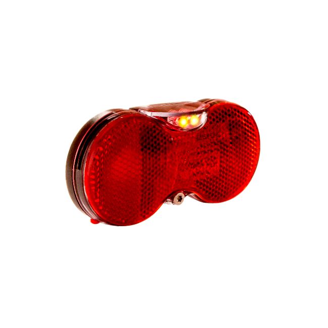 Baklampa för montering på pakethållare. Ger ett väl synligt ljus. Inbyggd reflex. Passar alla pakethållare med CC-mått på antingen 50 mm eller 80 mm (dvs: avståndet mellan skruvhålen är 50 mm eller 80 mm). Muttrar och brickor ingår. Perfekt som ersättare till din originalmonterade. Drivs av två AA-batterier som medföljer.