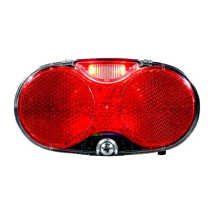 Baklampa för montering på pakethållare. Ger ett väl synligt ljus. Inbyggd reflex. Passar alla pakethållare med CC-mått på 50 mm (dvs: avståndet mellan skruvhålen är 50 mm). Muttrar och brickor ingår. Perfekt som ersättare till din originalmonterade. Drivs av två AA-batterier som medföljer.