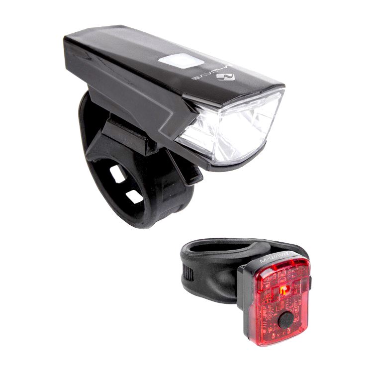 M-Wave Apollon K 15 USB är ett laddningsbart lampset. Det har en framlampa med ett vitt LED-sken på 70 lumen och 30 lux. Den har två olika inställningar: maximalt sken och batterispar-läge. Den fästs enkelt på styret utan verktyg och kan enkelt plockas av för förvaring eller för att användas som ficklampa. Den är vattentät och kan användas i regn. Framlampan drivs av ett uppladdningsbart lithiumjon-batteri som räcker i 3,5 timmar och har en laddningsindikator så att du vet hur mycket batteri du har kvar. Laddningskabel (USB) ingår. Baklampan har en LED-diod som ger ett fast rött sken. Den drivs av ett laddningsbart lithium polymer-batteri som laddas med den medföljande USB-kabeln.