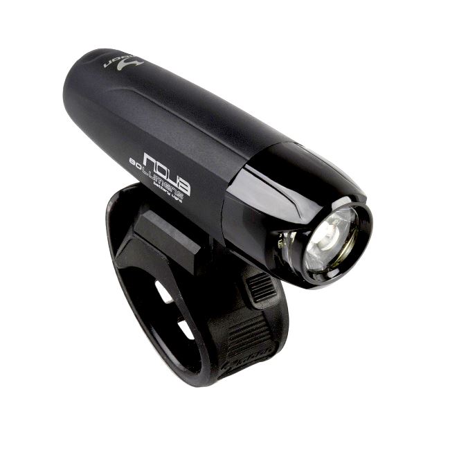 MOON Nova 80 är en liten supersmidig batteridriven cykellampa från amerikanska tillverkaren MOON. Den har fem olika ljuslägen och den starka CREE LED-ljuskällan ger 80 lumen och lyser upp vägen med 8 lux framför dig. Om du bara vill synas är den toppen. Om du cyklar där det är delvis mörkt fungerar den också bra. Kör du i fullt mörker bör du välja en kraftigare lampa. Lampan drivs av ett AA-batteri som ger följande brinntider: Standard: 20 lumens – 7,5 timmar High: 40 lumens – 3 timmar OverDrive: 80 lumens – 1,5 timmar Blinkande: 8 timmar Stroboskopiskt: 8 timmar