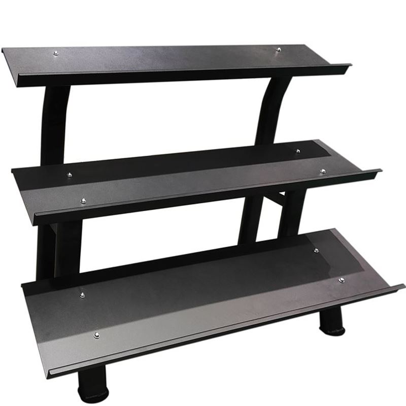 Snyggt och smidigt hantelställ från Master. Kan hålla upp till 15 par hantlar. Samtliga hyllor är vinklade med en kant som gör att hantlarna ligger lätt åtkomliga utan att ramla ner. Hantelstället är främst avsett för hexhantlar, vilka är 6-kantiga och alltid ligger plant mot underlaget utan att rulla undan. Specifikationer Mått (LxDxH): 1475 x 679 x 1027 mm Bredd på övre hylla: 280 mm Bredd på mellan hyllan: 330 mm Bredd på under hyllan 360 mm Detta ställ är anpassat för att kunna bära 2×2, 2×4, 2×6, 2×8, 2×10, 2×12.5, 2×15, 2×17.5, 2×20, 2×22.5, 2×25, 2×27.5, 2×30 KG. Totalt 400 KG hantlar.