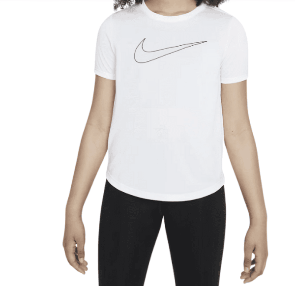 Nike gör fina tenniskläder och padelkläder för flickor Nike Dri-FIT One Top är inget undantag utan en mycket bekväm tshirt att bära oavsett om du spelar tennis eller padel. Den känns mjuk och lätt med svetttransporterande stöd. Denna produkt är tillverkad av 100 % återvunna polyesterfibrer.