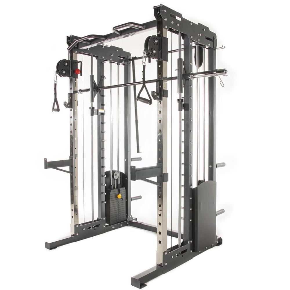 DAP / Smith / Rack – Combo är både robust och snygg, den är perfekt för hemma gymmet. Välj enkelt vilken vikt som passar dig bäst med viktmagasinen. Viktmagasinens kapacitet ligger på 80 kg och varje platta väger 5kg. Kvalitet: Semi-Kommersiell Vikt: ca 300 kg Bredd: 200 cm Höjd: 217 cm Längd: 135 cm Trissorna är ställbara och har 21 olika positioner med 25mm hål för tillbehör. På toppen finns ett chinsräcke för Pull/chins ups. DAP har 16st olika hödjlägen med 10cm i distans mellan varje. Maxbelasting för smithmaskinens skivstång: 300kg Funktioner 2st spotterarms 2st enkelgrepp 2st jpegs 2st chinsräcken 1st smithmaskin 4st vikskivsförvaring som är 20cm 1st skivstångsförvaring 1st fotmanschetter