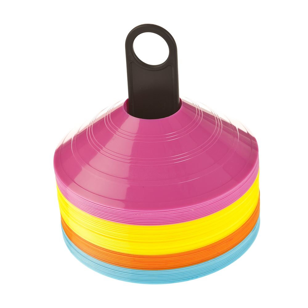 Dessa markeringskoner har blivit ett oumbärligt hjälpmedel för markering i idrott och lek. Speciellt för skolor, idrottsklubbar och även för motionsidrott. Markeringskonerna är praktiska att använda vid bland annat: Barnfester Trafikövningar: att köra slalom Fotbollsträning: som mål eller mållinje Skicklighetsbana Detaljer Färger: 20st Gula, 10st Blå, 10st Rosa, 10st Orange Diameter: 19 cm Höjd: 5 cm