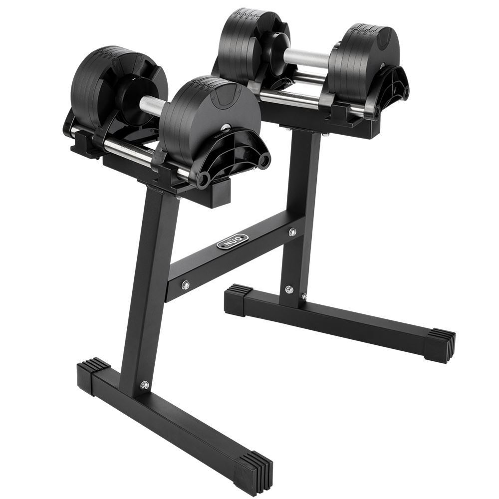 Paket innehållande NÜOBELL 2-20 kg i svart design samt praktiskt tillhörande hantelställ. Om NÜOBELL 2-20 kg NÜOBELL har en genial konstruktion som gör att du genom att vrida på handtaget justerar vikten på hanteln. När du har ställt in rätt vikt lyfter du upp hanteln och börjar träna. Den här versionen av NÜOBELL kan justeras 2-20 kg med endast 2 kg intervaller. Hantlarna kan ställas in till följande vikter. 2 – 4 – 6 – 8 – 10 – 12 – 14 – 16 – 18 – 20. Svenskt varumärke och patent med utveckling i Husqvarna. Välbalanserade och med distinkt klickljud för varje viktval Levereras i par. Vikterna har nyloninlägg för ett underhållsfritt och tyst användande. Handtag och vagga i anodiserad aluminium Garantin gäller ej om hantlarna tappas Om Floorstand Stilrent och ergonomiskt hantelställ för NÜOBELL hantlar. Tillverkat i pulverlackerat stål för bästa hållfasthet. Passar samtliga storlekar och modeller av NÜOBELL hantlar. NÜOBELL 220,232,550,580. NÜOBELL Floor Stand är konturerad så att hantlarna ligger fastskruvade i stället och kan enkelt skruvas ur med handkraft. Svenskt varumärke och patent med utveckling i Husqvarna. Verktyg medföljer för enkel montering