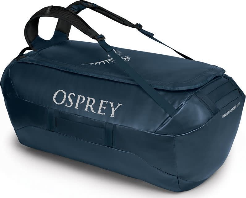 Transporter 120 från Osprey är en duffelväska med slitstarkt och vattenavvisande yttermaterial. Invändigt finns nätfickor och kompressionsremmar för organisering och utvändigt finns bröstrem med visselpipa och smidiga låsbara dragkedjor. De stuvbara axelremmarna gör att du kan välja hur du vill bära den – på ryggen eller i något av handtagen.
