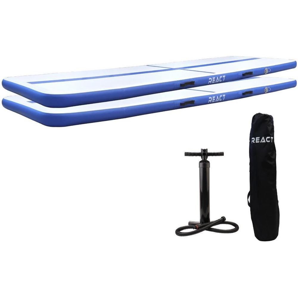 React 2 x AirTrack med handpump Letar du efter en prisvärd träningsmatta i hög kvalitet? En gymnastikmatta gör landningen mjukare och möjliggör högre studsar. Den minskar studsande ljud och dess ytmaterial förhindrar att du glider. Gymnastikmattan är ett utmärkt val för gymnastik, men även för grundläggande kondition eller lek. React AirTrack är en 3 m lång och 1 m bred träningsmatta för hemmabruk. Dess 10 cm tjocklek möjliggör mjuka landningar och högre hopp. Mattan levereras med en handpump som gör det möjligt att pumpa madrassen var som helst, samt en bärväska. Hållbara material: React AirTrack är vattenresistent och tillverkad av UV- och köldtåliga material. Lämplig för både inomhus- och utomhusbruk. Lätt att bära: Du kan använda React Airtrack var du än är. Den går snabbt att fylla, så du kan fylla den var som helst, i vardagsrummet, trädgården, gymmet eller till och med i poolen! Bra tillbehör medföljer: AirTrack levereras med en bärväska för bekväm transport. Samt en handpump så att du kan fylla mattan var du än är. Produkten innehåller också ett reparationsset och instruktioner. Mångsidig AirTrack: Om du vill att din matta ska vara mer flexibel och mjuk kan du välja att inte fylla den helt. Om du däremot vill ha en stabil och hårdare träningsmatta ska du fylla den helt. Det går väldigt snabbt att tappa ur luften ur React AirTrack. 1 års garanti : Garantin gäller även pumpen och bärväskan. Produktinformation: Mått: 3 x 1 x 0,1 m. 2 x React AirTrack Färg: Blå 2 x Bärväska för mattan 2 x Handpump 2 x Reparationsset 1 års garanti