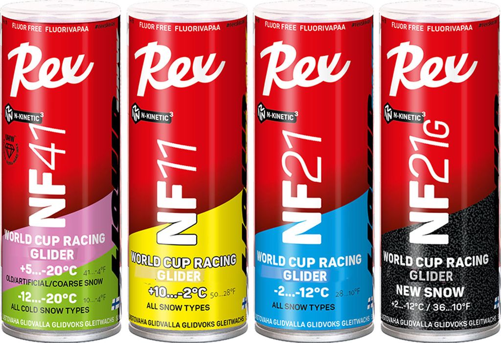 Rex N-Kinetic NF är ett fluorfritt koncept från finska Rex med N-kinetic teknik som har riktigt bra vatten- och smutsavvisande egenskaper som ger riktigt bra glid. Rex NF-serie är speciellt framtagna fluorfria alternativ för att ersätta Rex mest avancerade fluor-glidvallor. De har alla tekniska fördelar som Rex HF-vallor har men utan användning av fluor.NF-serien är riktiga race-vallor och används med fördel på tävlingar för att maximera glidet. Rex N-KINETIC™ är en fluorfri-teknik där nanopartiklar används i vallan för att bilda en hydrofob ytstruktur som är väldigt vattenavvisande och ökar även smutsavvisningen. NF11Yellow+10/-2Blöt och smutsig snöNF21Blue-2/-12Torr snö och under nollan (perfekt som baslager innan toppningsvallor)NF21GBlack+2/-12Grafit för nysnö – Ligger precis melan NF11 Yellow och NF21 BlueNF41Pink/Green UHW+5/-20För slaskig, grov eller konstgjord snö.Så här gör du:Skaka burkenGnid ut på glidzonenLåt torka 20min (ett MÅSTE!)Nylonborsta