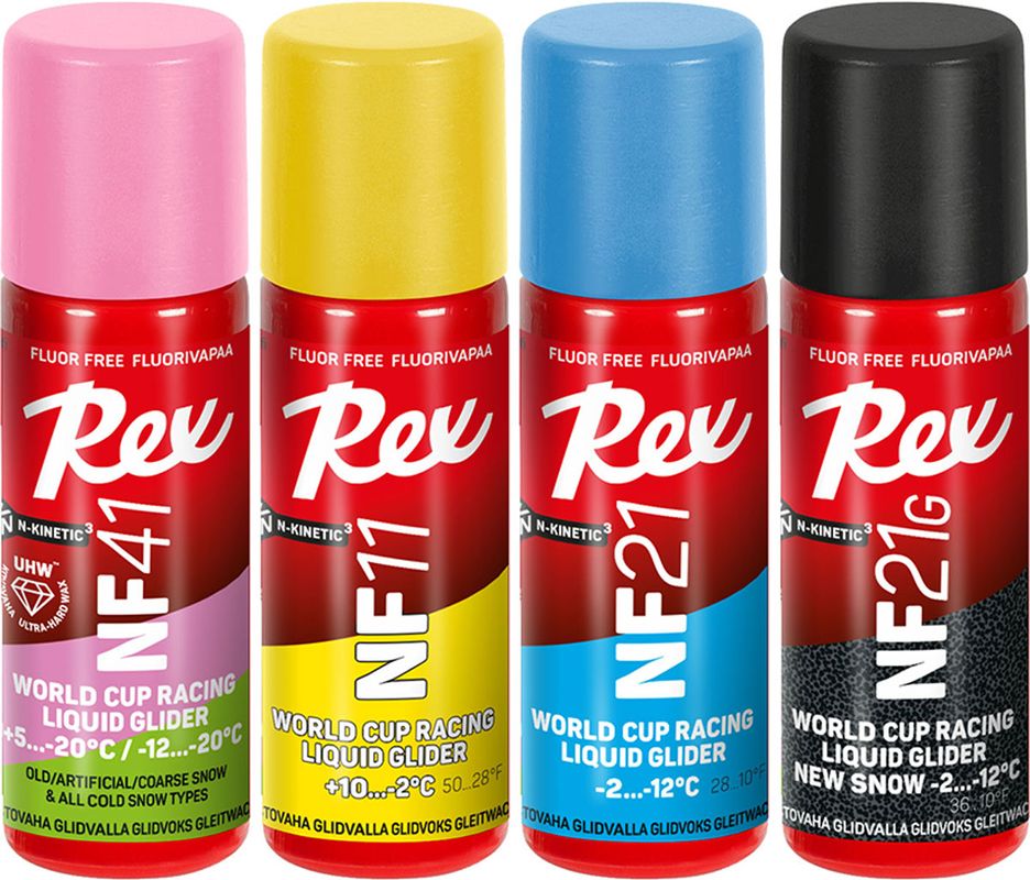 Rex N-Kinetic NF är ett fluorfritt koncept från finska Rex med N-kinetic teknik som har riktigt bra vatten- och smutsavvisande egenskaper som ger riktigt bra glid. Rex NF-serie är speciellt framtagna fluorfria alternativ för att ersätta Rex mest avancerade fluor-glidvallor. De har alla tekniska fördelar som Rex HF-vallor har men utan användning av fluor.NF-serien är riktiga race-vallor och används med fördel på tävlingar för att maximera glidet. Rex N-KINETIC™ är en fluorfri-teknik där nanopartiklar används i vallan för att bilda en hydrofob ytstruktur som är väldigt vattenavvisande och ökar även smutsavvisningen. NF11Yellow+10/-2Blöt och smutsig snöNF21Blue-2/-12Torr snö och under nollan (perfekt som baslager innan toppningsvallor)NF21GBlack+2/-12Grafit för nysnö – Ligger precis melan NF11 Yellow och NF21 BlueNF41Pink/Green UHW+5/-20För slaskig, grov eller konstgjord snö.Så här gör du:Skaka burkenGnid ut på glidzonenLåt torka 20min (ett MÅSTE!)Nylonborsta