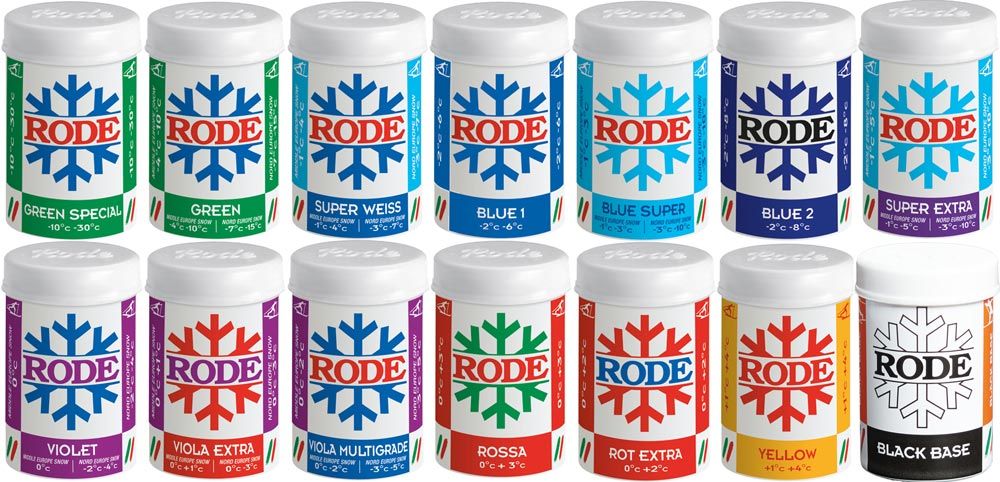 Rode har erkänt bra burkar när det är finkornig snö och det är svårare att hitta vallor som fäster och glider lika bra. Black BaseGrundvax hög slitstyrkaGrön-7/-15Grön Special -30/-10Blå Multigrade-5/-12Blå Super Extra-3/-10Blå Super-3/-10Blå Super Weiss-3/-7Blue I-2/-6Blue II-2/-8Violett Multigrade-3/-5Violett-2/-4Violett Extra0/-3Gul+1/+4 (Nollföres valla)Rossa0/+2Rot Extra0/+2