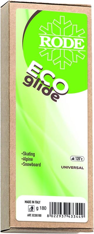 Rode Eco Glide Paraffin 180g är en helt naturlig, ekologisk och biologiskt nedbrytbar universal glidvalla som läggas på med hjälp av vallajärn. Inga petroleumbaserade komponenter!Denna produkt visade överraskande goda glidegenskaper med hög slitstyrka i tester. En utmärkt produkt för dig som vill ta hand om sina skidor på ett grönt sätt. För förpackningen tyckte Rode att det var viktigt att vara konsekvent med dess innehåll och därför kommer det packat i en ekologisk kartong!