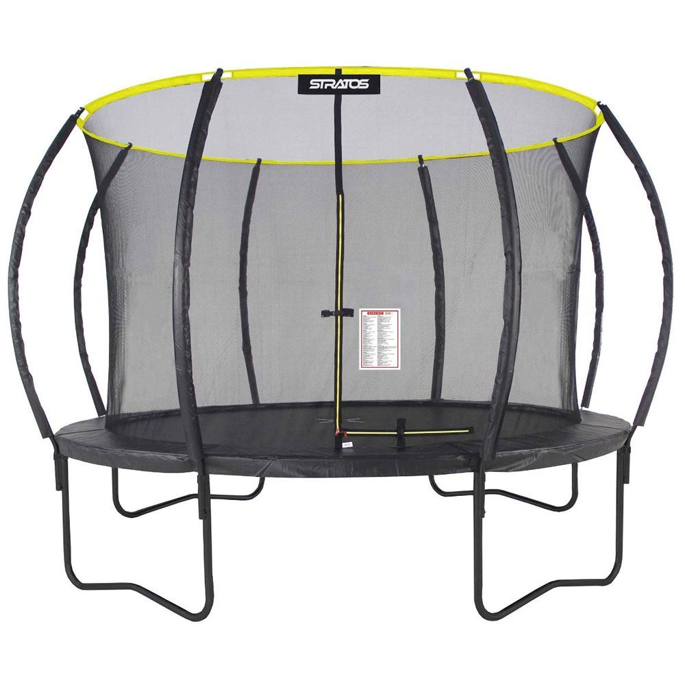 Det stora hoppområdet och den stora motståndskraften hos Stratos studsmattor säkerställer en rolig och aktiv stund. De tjocka stamrören på Stratos ser till att studsmattan håller från år till år! Tjockleken på kroppen och fotröret är hela 1,5 mm! Säkerhetsnätets böjda design gör Stratos extremt säker. Skyddsnätet är också placerat inuti kantskyddet, vilket ökar säkerheten. Stratos långa guldpläterade fjädrar gör studsarna mjuka och lanserar sina byglar högt in i nya sfärer. Den svarta pulverlackerade ramen och de gula detaljerna kompletterar det snygga utseendet. Den riktigt slitstarka halksäkra mattan är UV-skyddad och bleknar inte i solljus. Produktinformation Trampoline 12 ft Storlek: 3,66 m Användar max. vikt: 150 kg Ramhöjd: 80 cm Antal ben: 4 st Ramrörsstorlek: 38×1,5 mm Fotstorlek: 38×1.2 mm Matta: UV-skyddad halkskydd Kroppsmaterial: Varmförzinkad rostfri metall Antal fjädrar: 72 st Fjädrar: Varmförzinkad rostfri metall med pulverlack; 3.0×135 mm Kantskiva: 13 mm EPE-skum 310g PVC / 130g PE Skyddsnätrör: 25,4×1,2 mm Säkerhetsnät: 10 mm EPE-skum Skyddsnät: 95 g PE Säkerhetsnätets höjd: 180 cm Vikt: 76,4 kg Trampoline 14 ft Storlek: 4,27 m Användar max. vikt: 150 kg Ramhöjd: 90 cm Antal ben: 4 st Ramrörsstorlek: 38×1,5 mm Fotstorlek: 38×1,5 mm Matta: UV-skyddad halkskydd Kroppsmaterial: Varmförzinkad rostfri metall med pulverlack Fjädrar: 88 st Fjädrar: Varmförzinkad rostfri metall 3.1×177 mm Kantskiva: 20mm EPE-skum 310g PVC / 130g PE Skyddsnätrör: 25×1,2 mm Säkerhetsnät: 10 mm EPE-skum Skyddsnät: 110g PE Säkerhetsnätets höjd: 185 cm Vikt: 87,8 kg