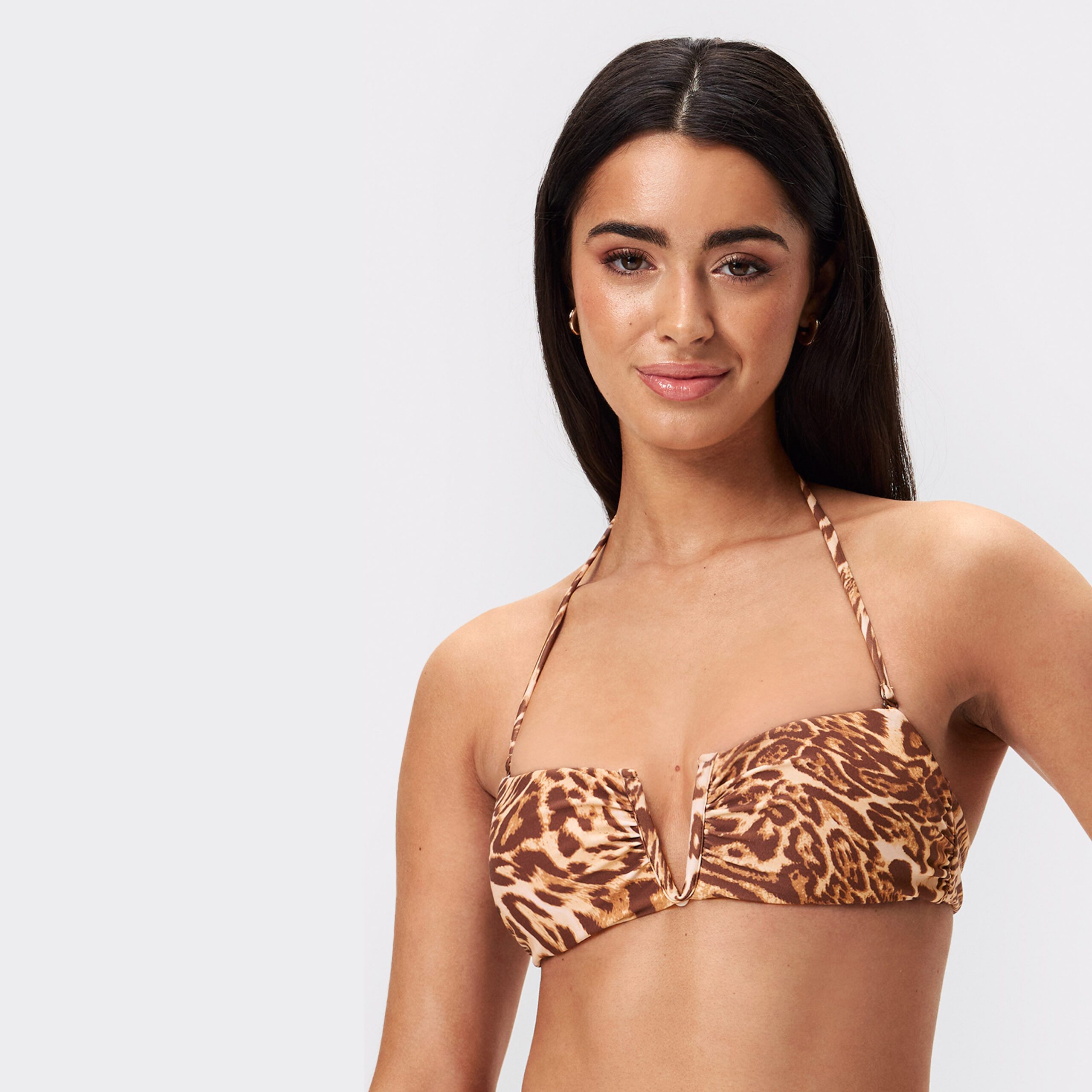 Denna modell passar bäst för kupstorlekar A–C. Vår leopardmönstrade Bandeau Bikini Top ger lätt support ochär gjord av ett glansigt, snabbtorkande material som andas – perfekt för stranden. Den har en ljusorange linning och en V-formad metalldetalj framtill som ger en stilren touch. Bikinin knäpps med en hakstängning bak och kan anpassas med avtagbara halterneckband och uttagbara kupor för en flexibel passform. Använd alltid en tvättpåse när du tvättar den här bikinitoppen, då den har en V-formad metalldetalj.