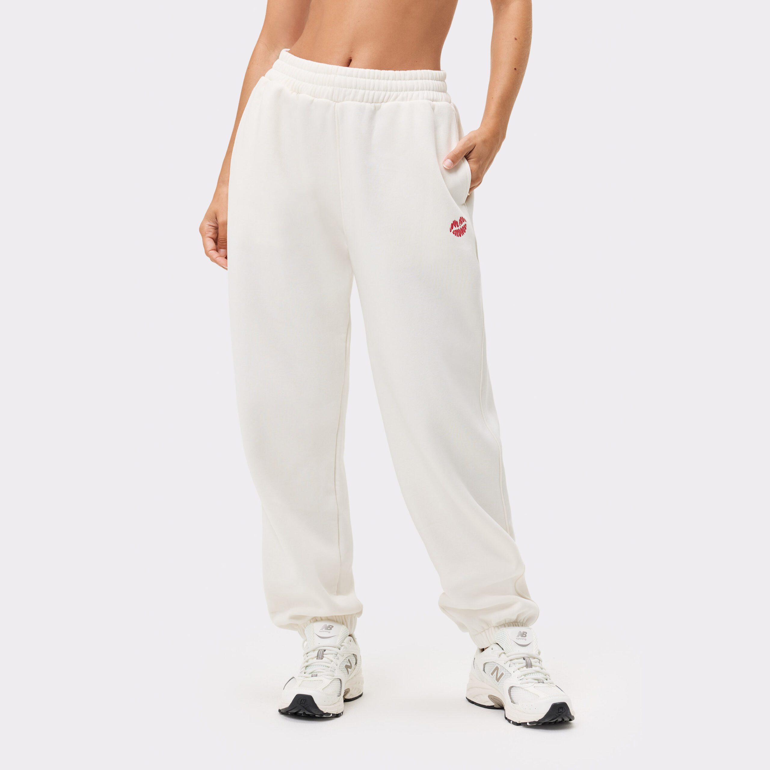Comfy Sweatpants i vitt från Stronger – mjuka, andningsbara mjukisbyxor med mellanhög midja, Oversize fit och rak passform. Fickor på sidorna och mjuk, borstad insida. Ekologisk bomull & återvunnen polyester.