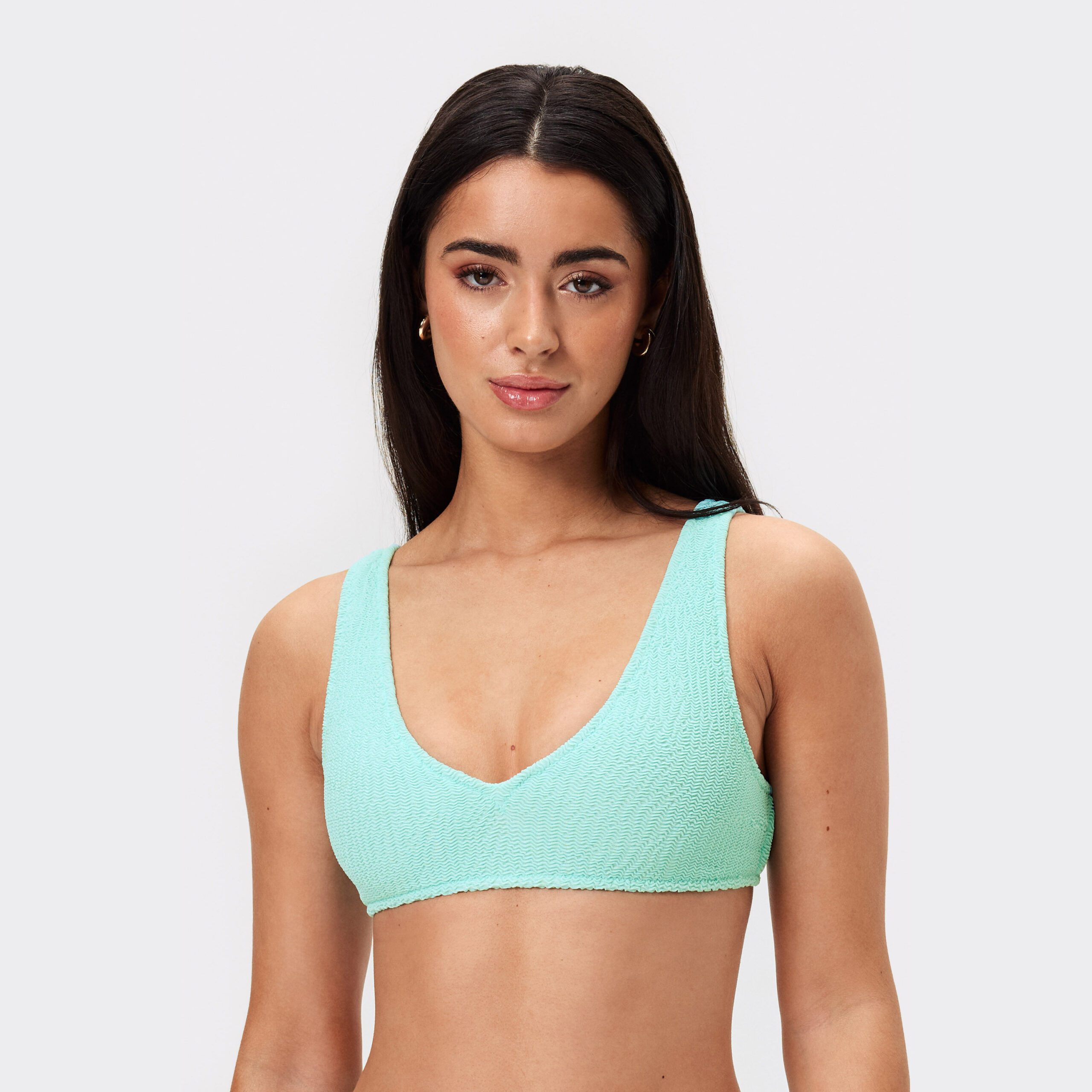 Köp Stronger’s Textured V-neck bikini top i Aruba Blue. Tillverkad med texturerat tyg i polyamidblandning och V-ringad design. Perfekt för strand- och pooldagar. Handla nu!