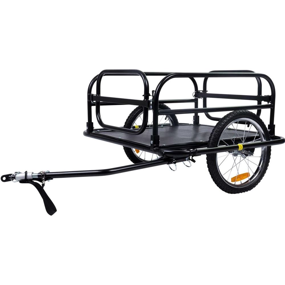 Trekker cykelkärra Denna stadiga och hållbara Trekker dragkärra är en transportkärra som kan fastsättas på cykeln, men vilken du kan transportera saker upp till 60 kg. Den ihopfällbara stålstommen och hjulens snabblås gör denna dragkärra dessutom enkel att förvara. Stora 16" hjul klarar även av lite ostadigare , sandiga vägar och garanterar en mjuk åktur. Produktinfo: Stommens material: Stål Ihopfällbar Hjulens storlek: 16" Snabblås på hjulen Universaali fastsättning (för 24-28" hjul) Lastningsstorlek: 70 x 57,5 x 32cm Bottenmaterial: PE Viktgräns: 60kg