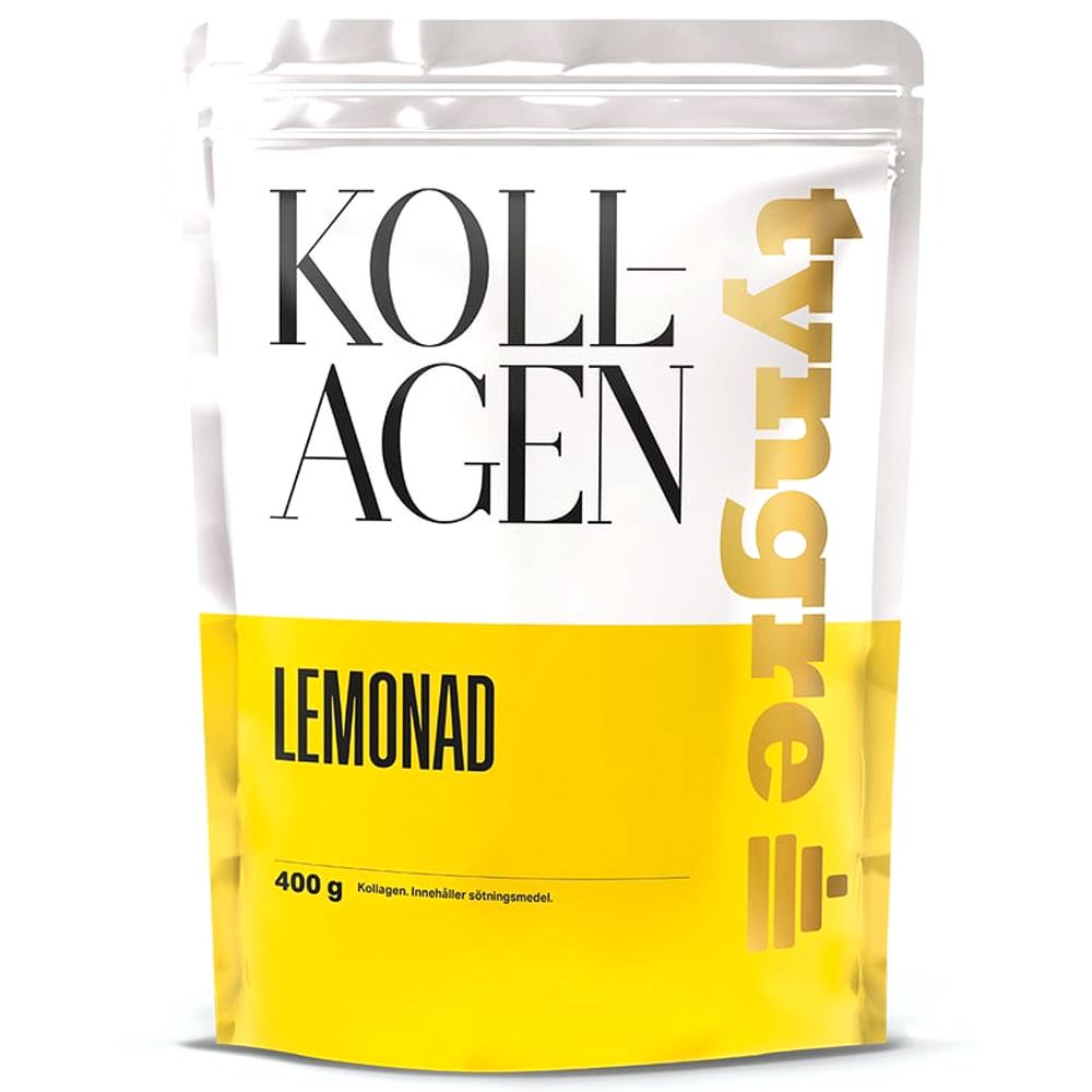 Äntligen ett kollagenpulver av toppkvalitet (100 % Peptan), med delikat smak av lemonad, och som dessutom är riktigt prisvärt! Varför inte boosta effekten och testa att blanda ihop med vår PWO Lemonad? Kollagen Lemonad: En nyhet från Tyngre! Kollagen används normalt av en rad olika anledningar: traditionellt sett har folk konsumerat det för att förbättra kvaliteten på hud, hår och naglar – men på sistone har också allt fler börjat testa att inta kollagen inför styrketräning och i samband med träning generellt för att på så vis stärka benmassan. Testa vårt Tyngre kollagen lemonad och du kommer inte att bli besviken! Fördelarna med kollagenpulver är många, men med smak av lemonad räcker det med smaken för att du ska älska det! Näringsvärde Per 100g Per Portion (15g) Energi 1243 kJ/297 kcal 186 kJ/45 kcal Fett <0,5 g <0,5 g varav mättat fett <0,1 g <0,1 g Kolhydrat 3,9 g 0,6 g varav sockerarter <0,5 g <0,5 g Protein 70 g 11 g Salt 0,8 g 0,12 g Ingredienser Kollagen (från nöt), surhetsreglerande medel (citronsyra), antioxidationsmedel (askorbinsyra, natriumcitrat), naturlig citronarom, sötningsmedel (aspartam*, acesulfam K), arom, färgämne (karoten). *Innehåller en fenylalaninkälla. Innehåll : 400 g, vilket motsvarar ca 27 portioner. Skopa medföljer inte, använd en matsked. 1 portion innehåller 13 gram kollagen. Användning: Ca 2 matskedar (15 g pulver) blandas med drygt 3 dl vatten. Förvaring: Förvaras torrt i rumstemperatur.